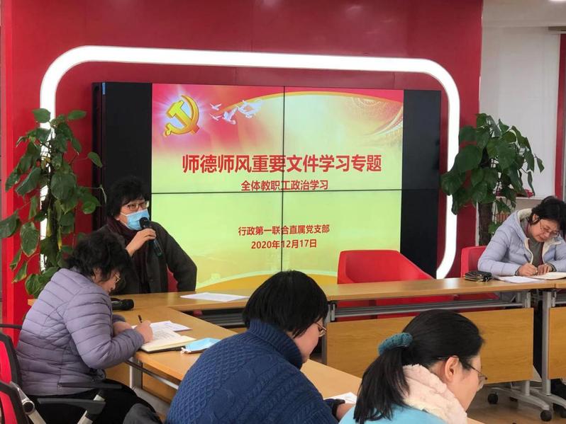 为进一步贯彻党的教育方针,持续加强支部教职工师德师风建设,对标上级最新精神和要求,12月17日下午,行政第一联合直属党支在北苑1号楼500党员活动室组织了师德师风重要文件的专题学习,本次学习由王永芝书记主持,全体教职工参加。
